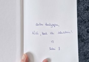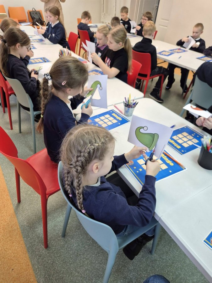 Galiausiai visi vaikai ant nykštukų kepurėlių paliko palinkėjimus bibliotekos skaitytojams ir paslėpė juos bibliotekos pirmame aukšte.